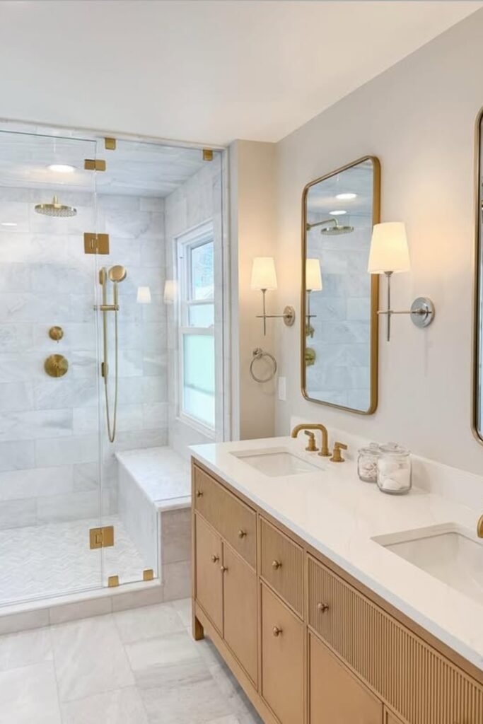You will love the polished gold hardware instantly warms up an all-white marble bathroom, making it feel elegant instead of cold.