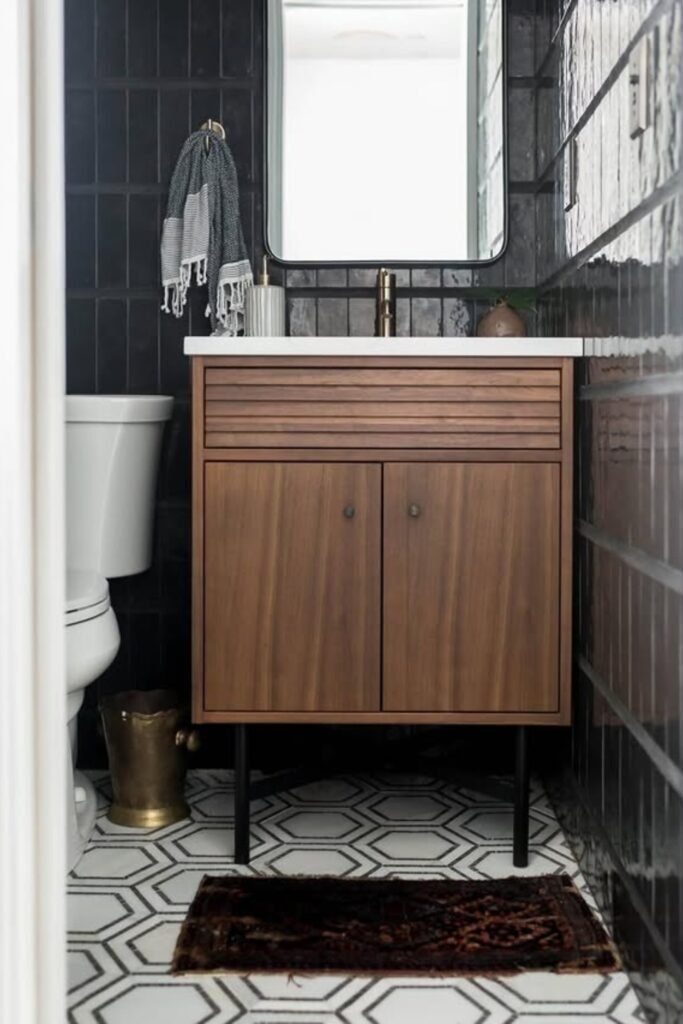 You can give your small bathroom a bold, cocoon-like vibe by pairing moody black tiles with a warm wood vanity.