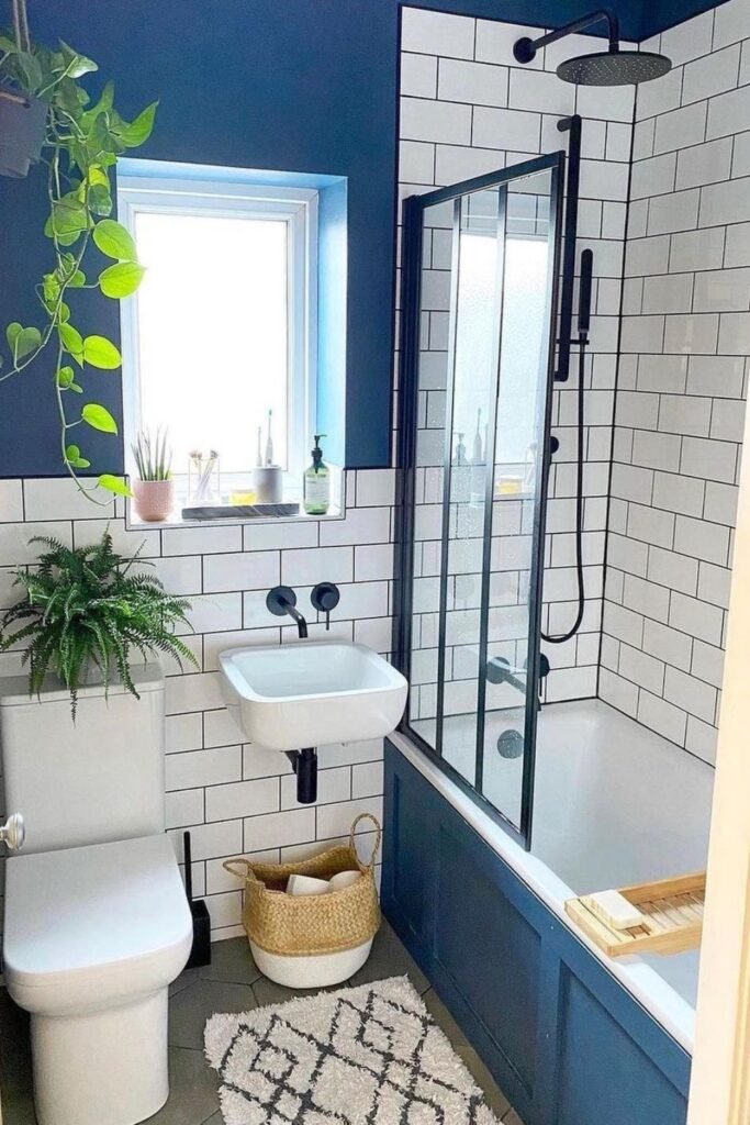You will make a small bathroom pop by combining navy paneling with black-framed glass.