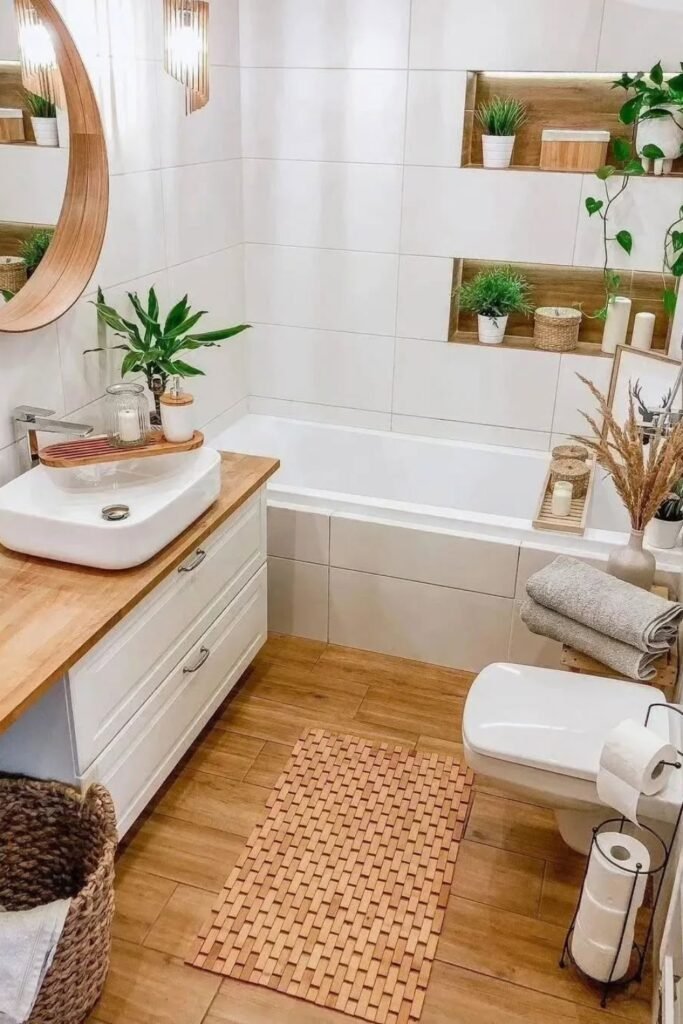 You will instantly warm a compact bathroom with layered wood and recessed shelving.