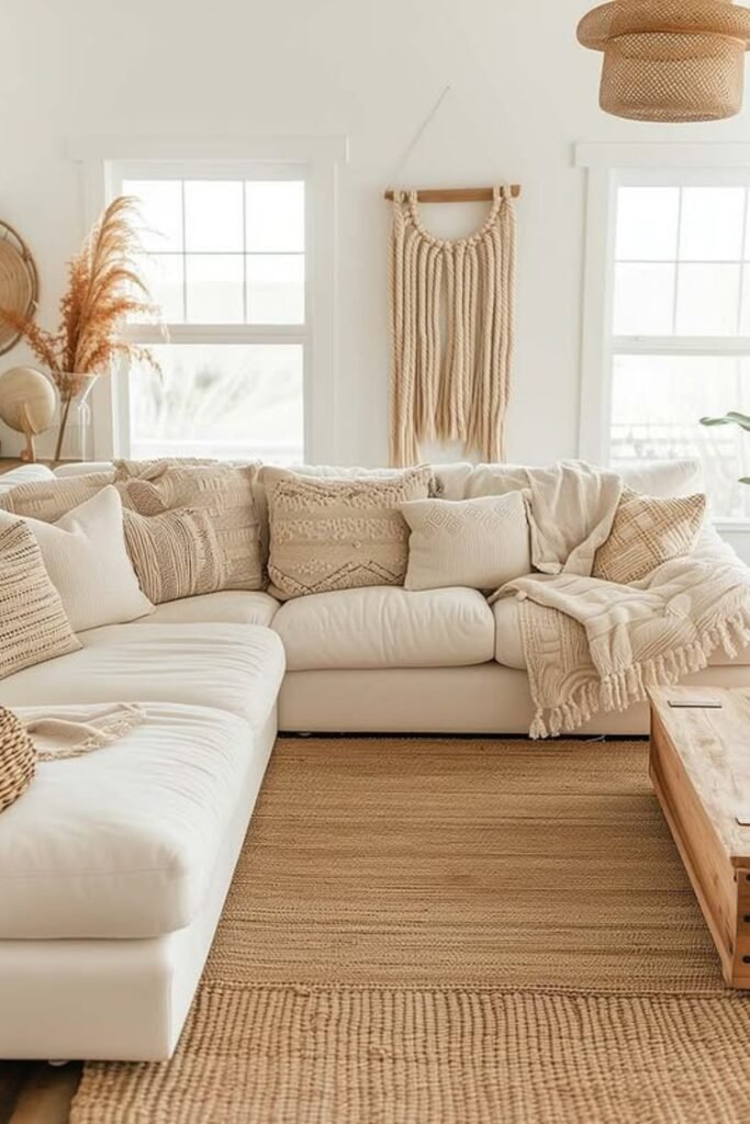 A low-profile sectional keeps the space grounded, while layered cushions and throws add depth without clutter.