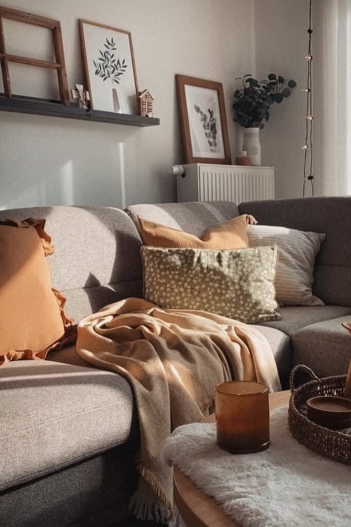 You can start with a neutral sofa, then add depth through throws, cushions, and a textured rug.