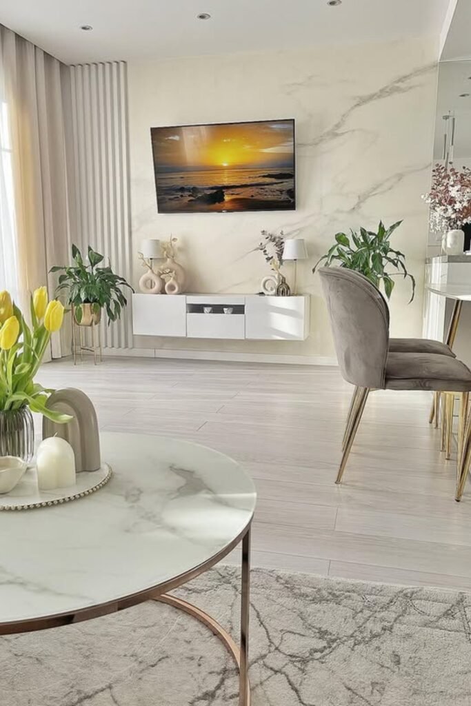 A floating console, marble-look walls, and slim furniture legs keep the space open instead of heavy.