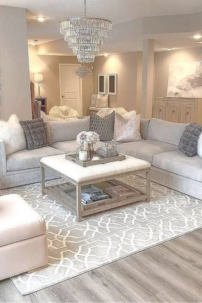 A plush sectional in a muted tone sets a calm base, while blush accents, faux fur pillows, and knitted throws add a gentle glam touch.