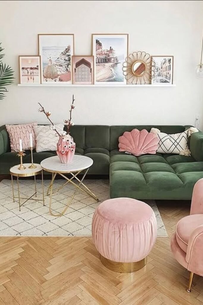 A deep green sofa instantly anchors the space, while blush accents soften the look so it doesn’t feel heavy.
