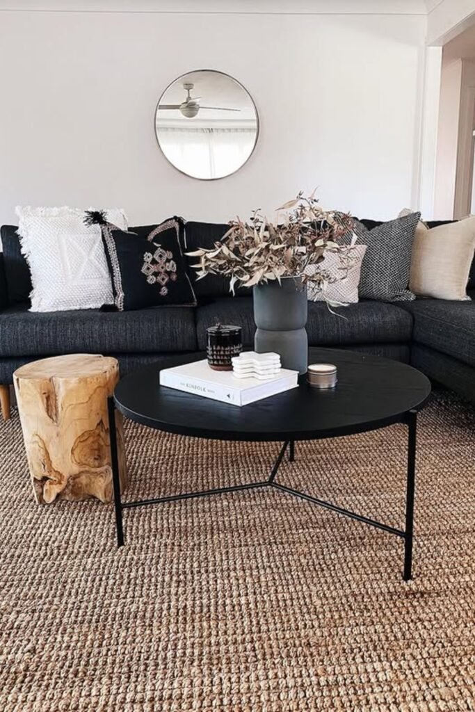 You can keep the coffee table simple and round to soften sharp lines, then add contrast through cushions and subtle decor.