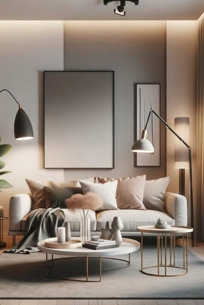 You can keep the sofa simple, then let warm light bounce off neutral walls and metallic tables.
