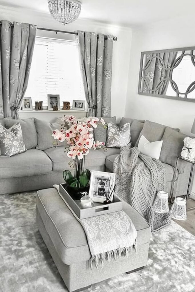 The different shades of gray across the sofa, rug, and cushions create depth, which keeps the space from feeling dull or boxed in.