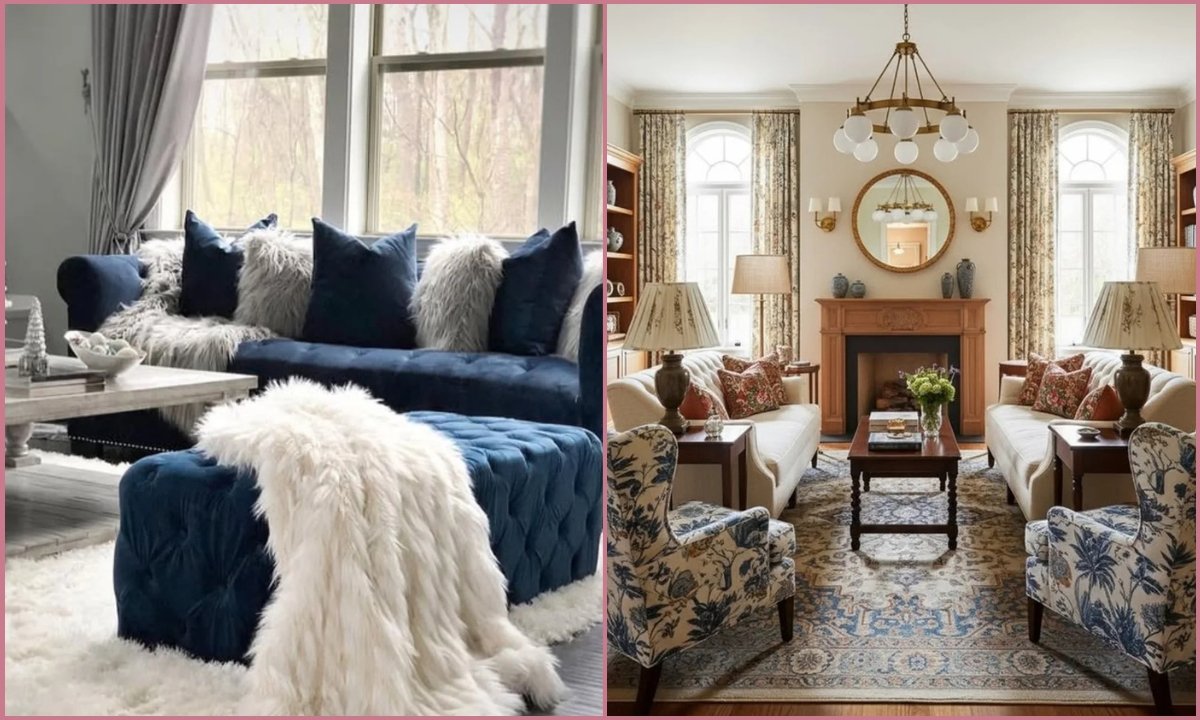 A tufted sofa brings instant glam, while patterned rugs and framed art add personality without chaos.