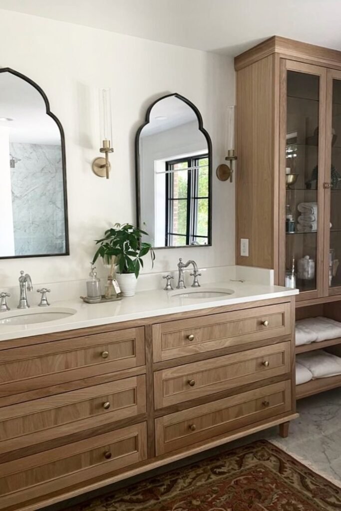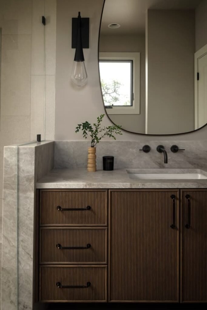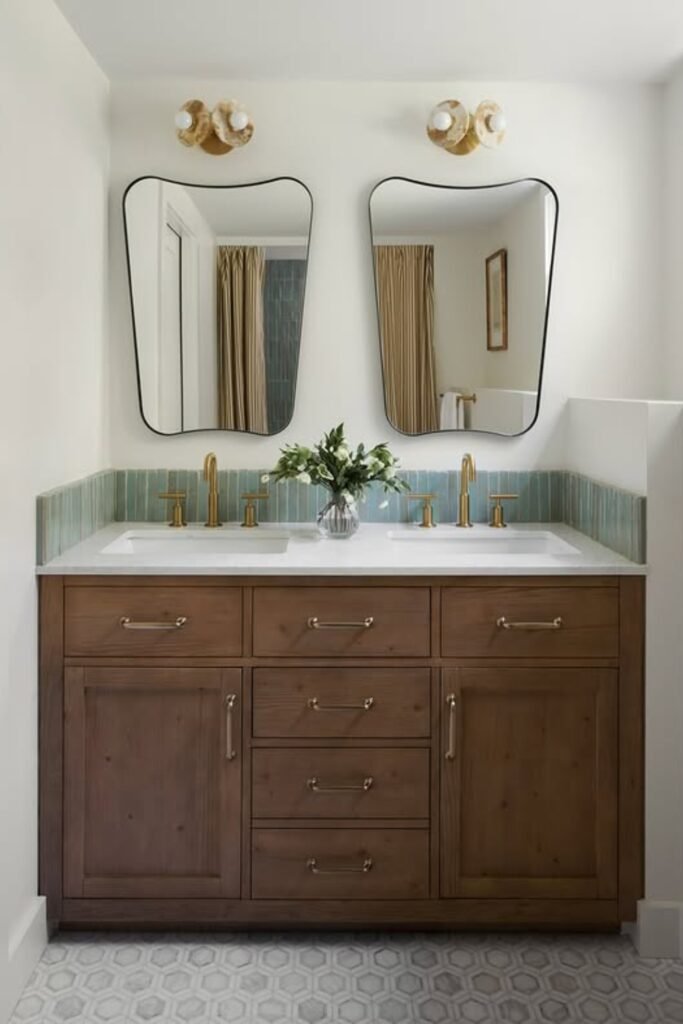 It reflects light, doubles the visual width, and removes breaks that make walls feel chopped up. This works especially well with a long counter or double sinks.