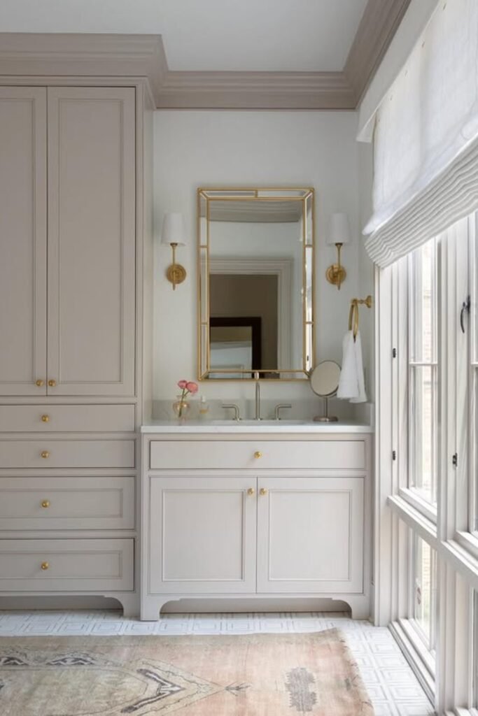 You can keep storage built into the vanity or adjacent cabinets rather than adding pieces near the window.