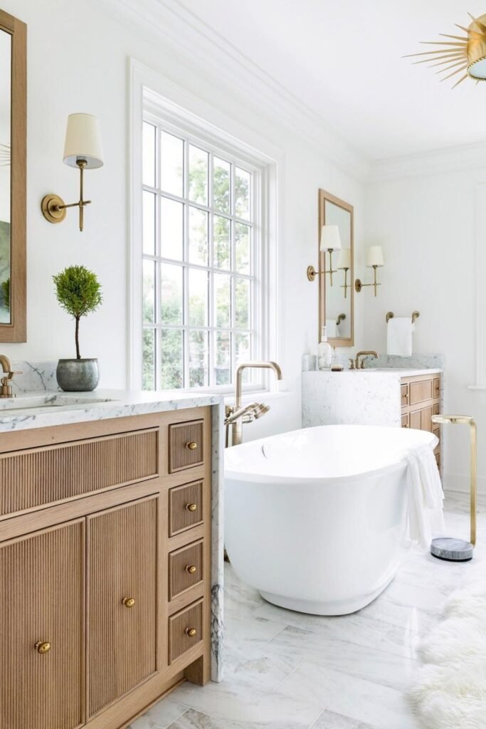 This layout works because the tub sits near natural light and doesn’t block the main walkway or vanity access.