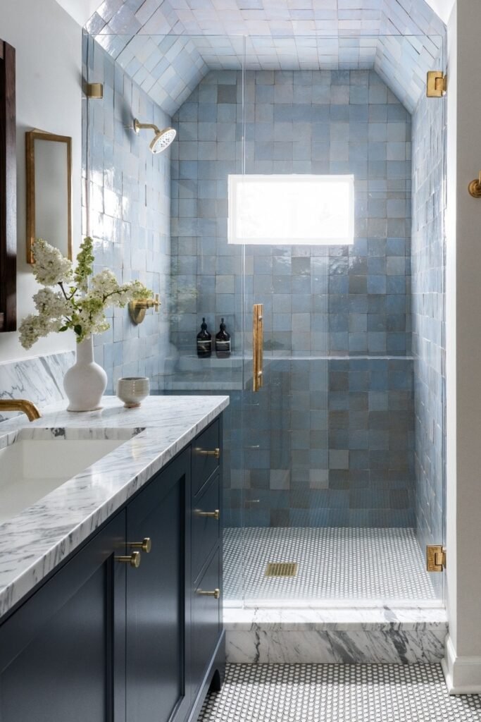 If your master bath is long and narrow, this kind of layout works better than you think. Keep everything in a straight line and avoid bulky pieces.