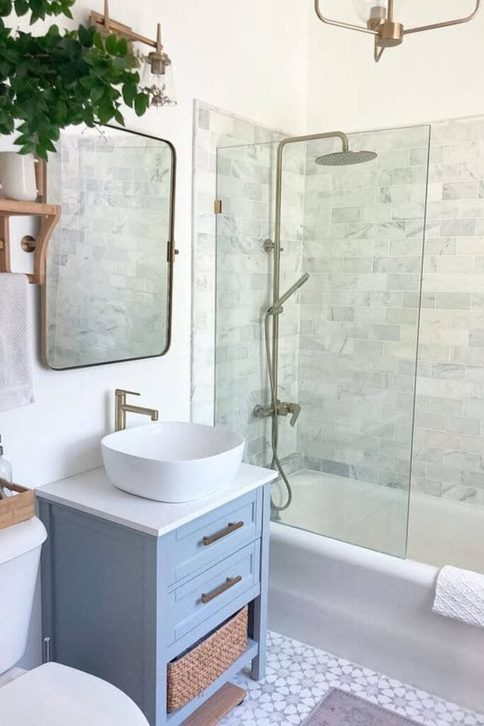 A clear glass panel keeps the space feeling open instead of boxed in. You can keep the vanity narrow and storage vertical so the tub doesn’t dominate the room.