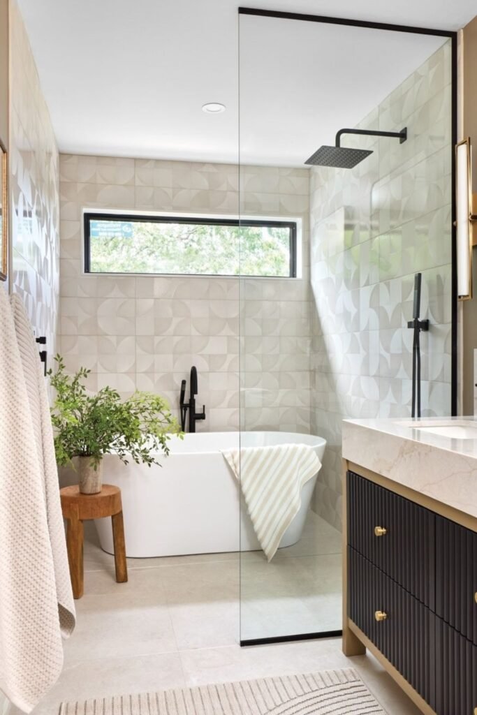 You let the tub and shower share one continuous space, with glass doing just enough to control water without breaking the flow.
