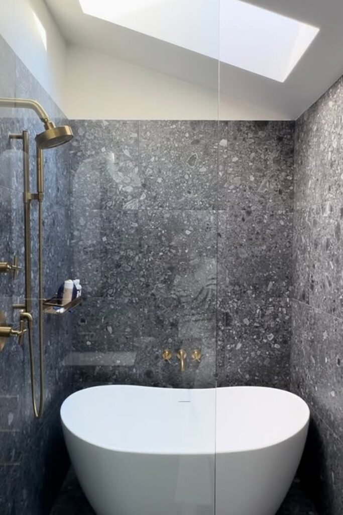 You place the tub directly inside the shower zone and surround everything with dark stone, which gives you that private spa feeling.