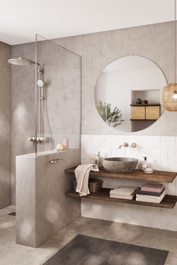 You soften sound and light with plaster-textured walls, instantly giving you that hammam-style spa feeling.