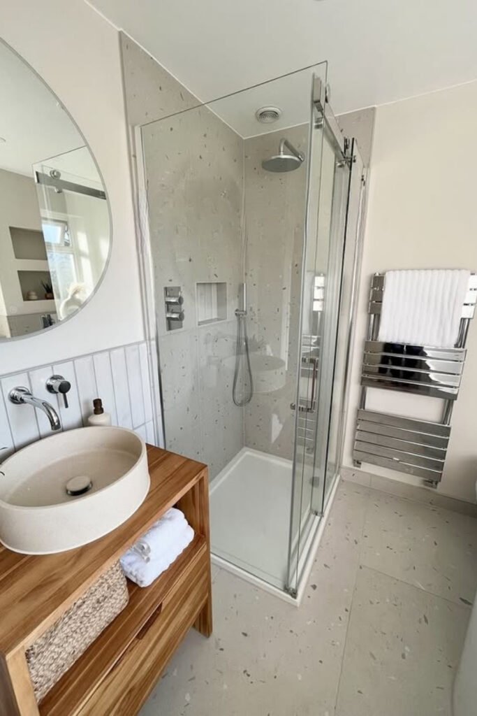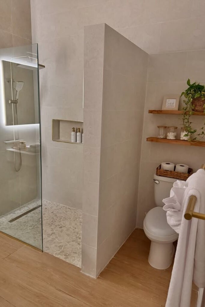 A floating wood vanity adds warmth without taking visual space, and open shelving keeps essentials accessible but controlled.