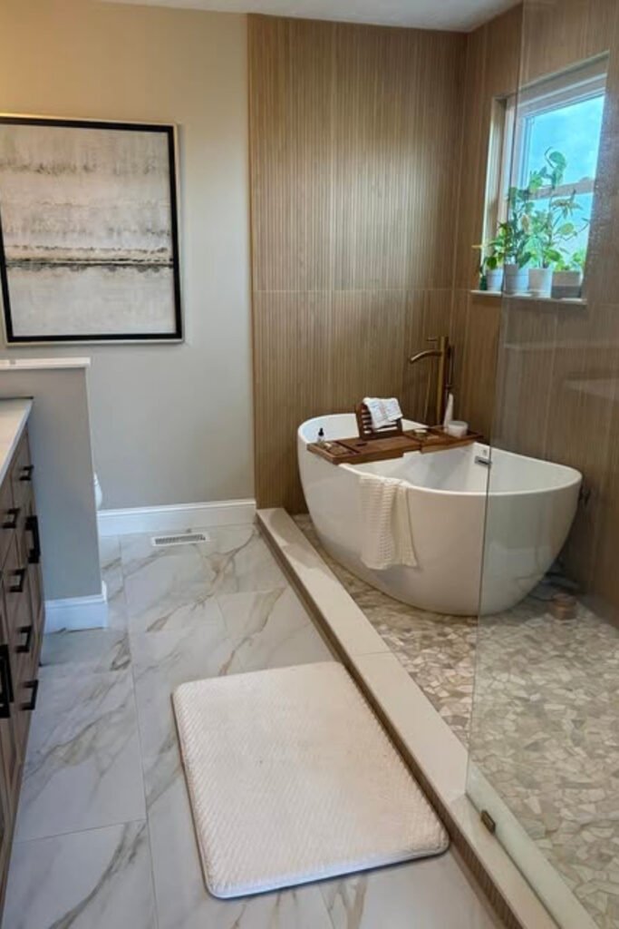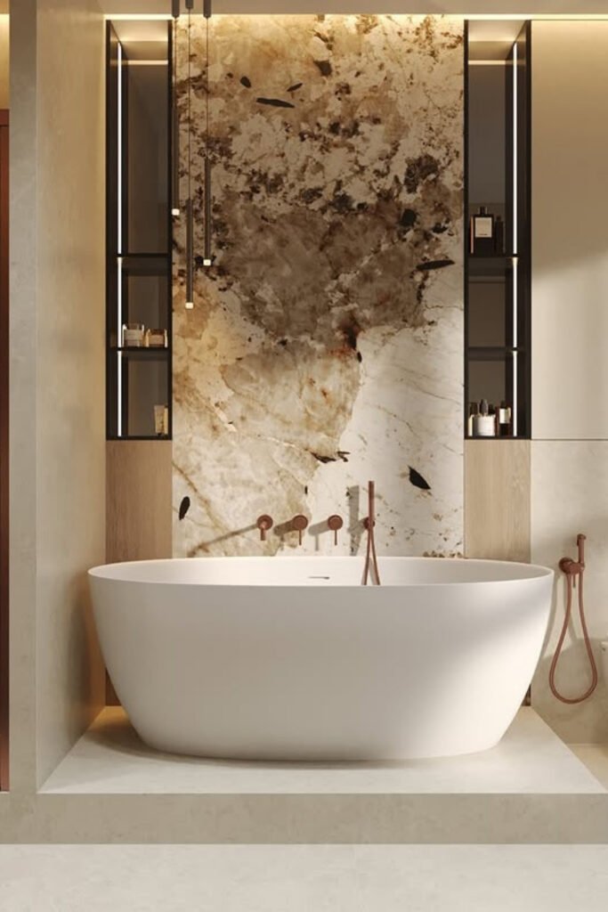 You can choose one dramatic stone or slab-look tile, keep the tub simple, and add soft side lighting so the stone feels warm rather than overpowering.