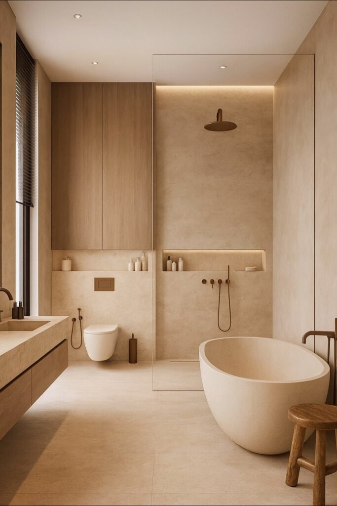 The freestanding tub becomes a sculptural centerpiece, while the walk-in shower with concealed lighting adds depth without visual clutter.