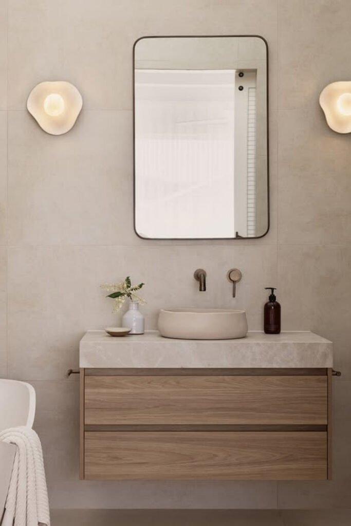 This bathroom feels carved rather than built, with gentle stone textures doing most of your storytelling.
