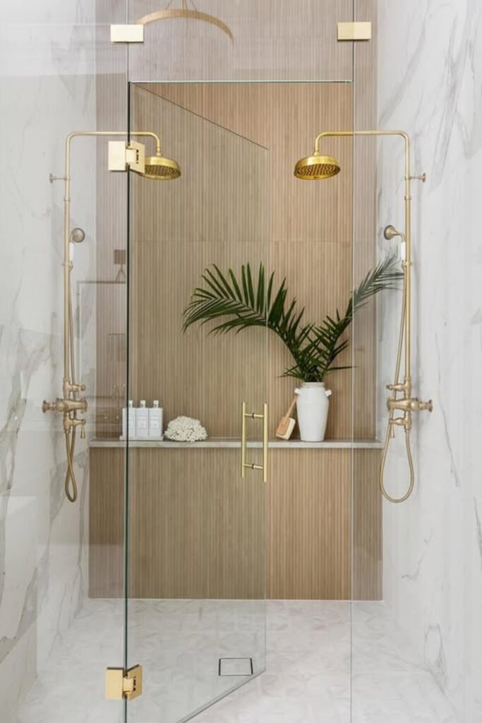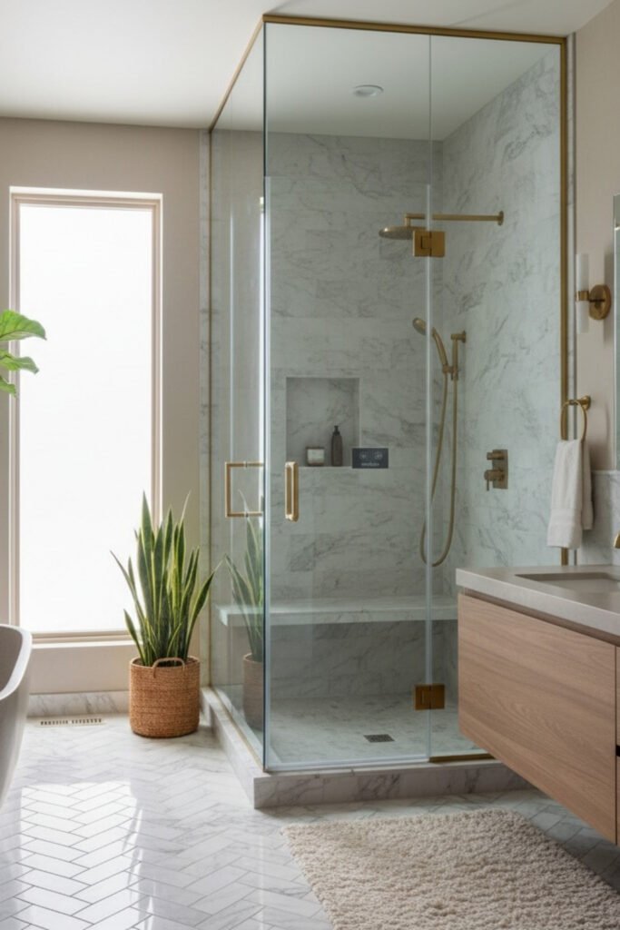 You see clear glass, wall-mounted fixtures, and the same marble flowing from one surface to the next, so you don’t feel boxed in.