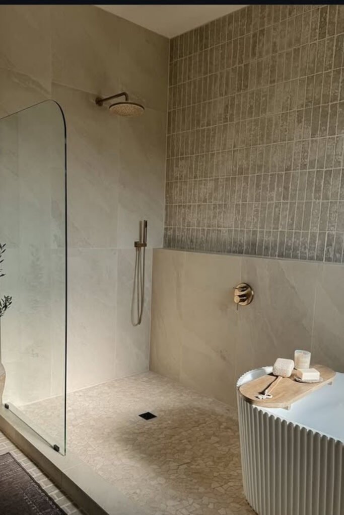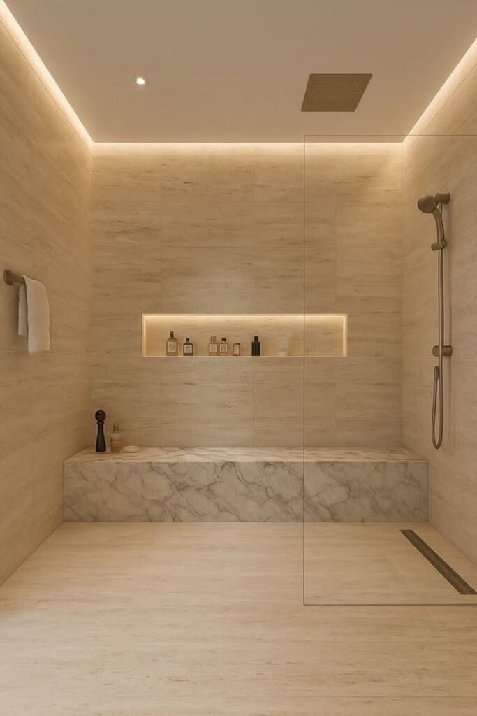 This shower changes how you use the space the moment you add a built-in bench. You’re not just showering anymore, you’re sitting, breathing, and slowing down.