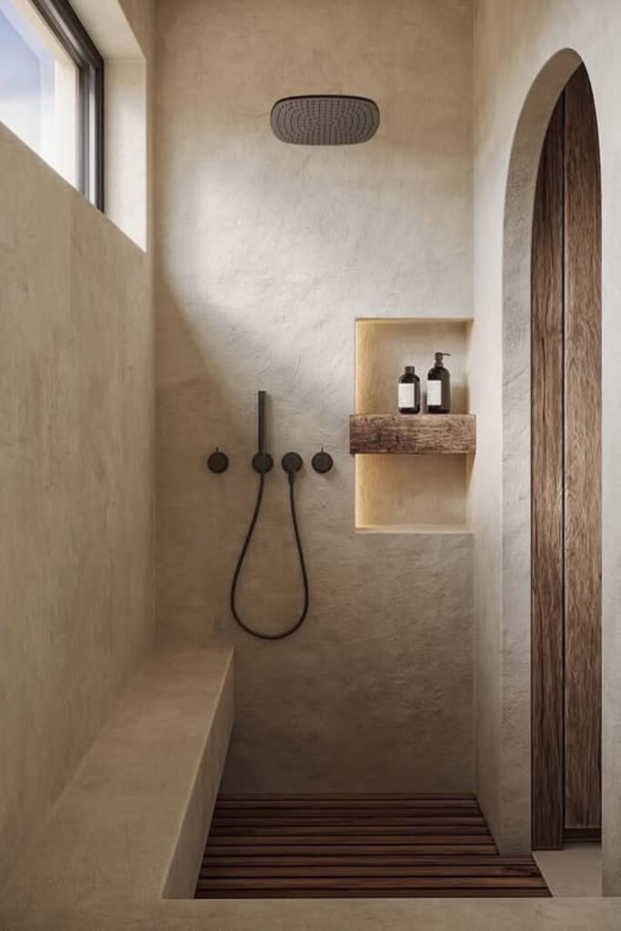 You turn a quick rinse into a ritual with a built-in bench, while the arched doorway gives you privacy without closing the space off.