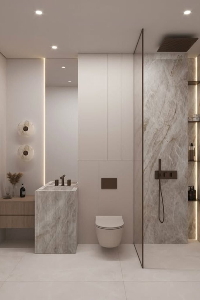 You use large-format marble tiles to reduce visual noise, and instantly the space feels bigger and more spa-like.