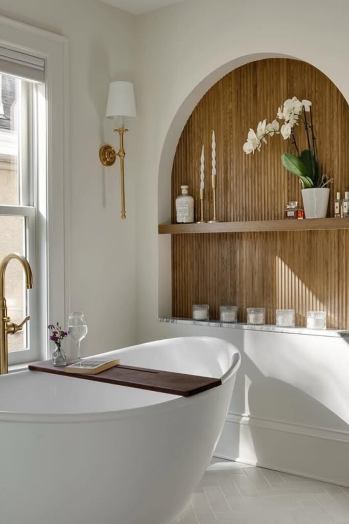 You can build a recessed niche behind the tub, line it with warm texture, and keep styling minimal so the space feels restful instead of decorative.