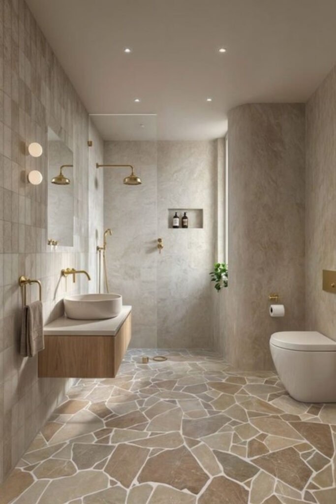 The floor sets the tone here before anything else does. Irregular stone tiles add texture and warmth, which instantly makes your bathroom feel more like a spa than a standard washroom.