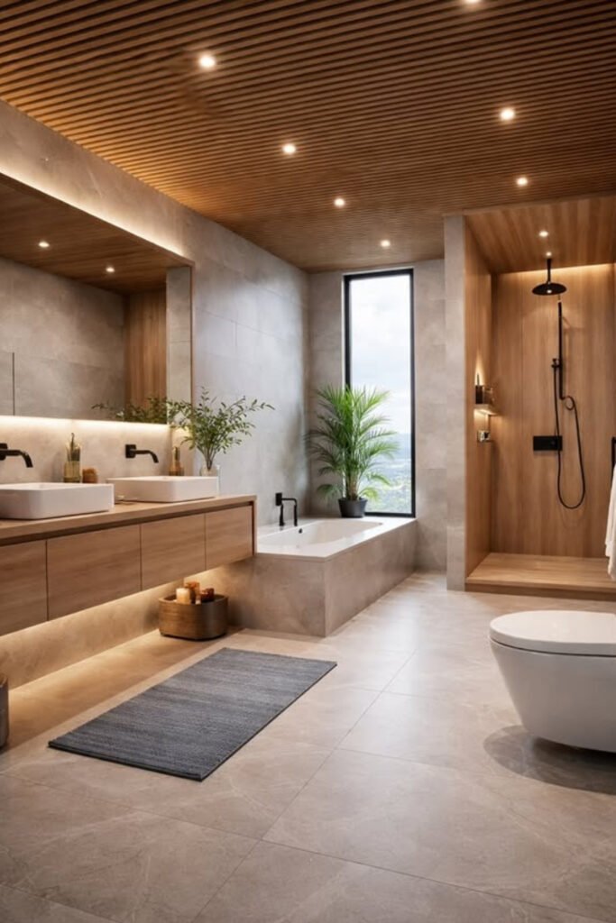 You can use moisture-safe wood slats or wood-look panels, add recessed warm lighting, and keep walls neutral so the ceiling becomes the quiet feature that ties everything together.