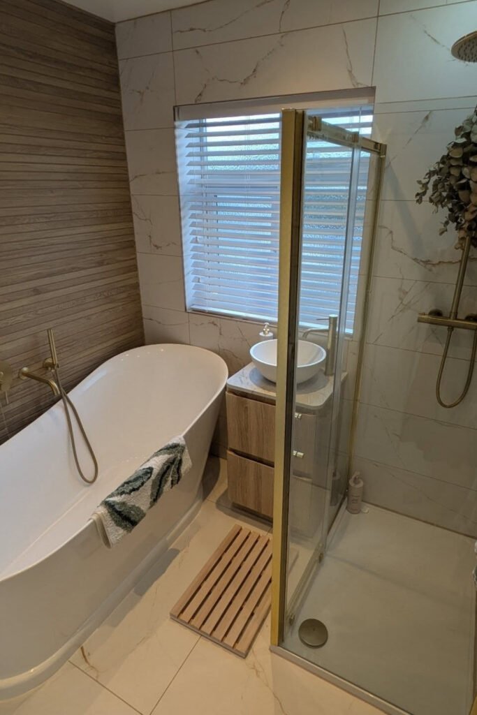 The freestanding tub is slightly raised, which visually separates your bathing area and makes it feel intentional, almost like a retreat within the room.