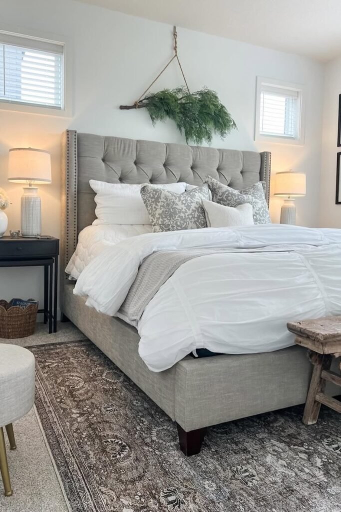 You’ll see how the soft taupe walls blend into the upholstered headboard, and you’ll notice that crisp white bedding keeps everything bright.