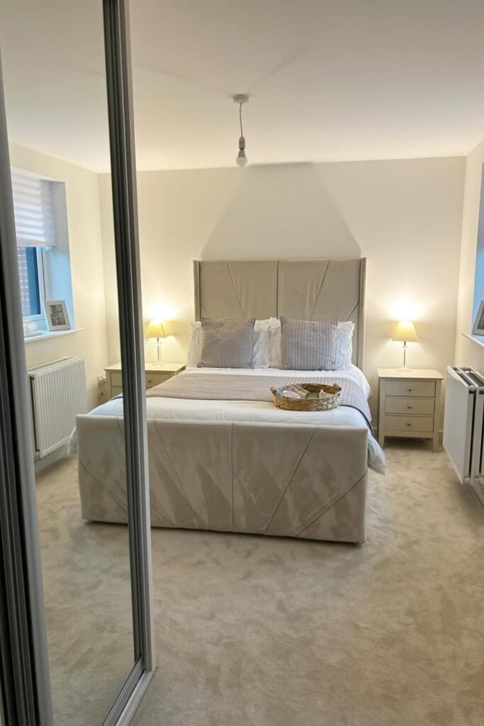 You can add matching bedside tables and warm lamps to create symmetry without adding contrast. Nothing fights for attention, and you’ll love how the space feels clean.