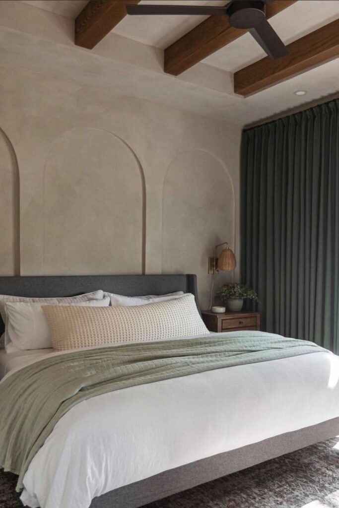 You’ll see how the soft taupe wall arches add quiet detail, while deep green curtains and a sage throw bring life without overpowering the room.