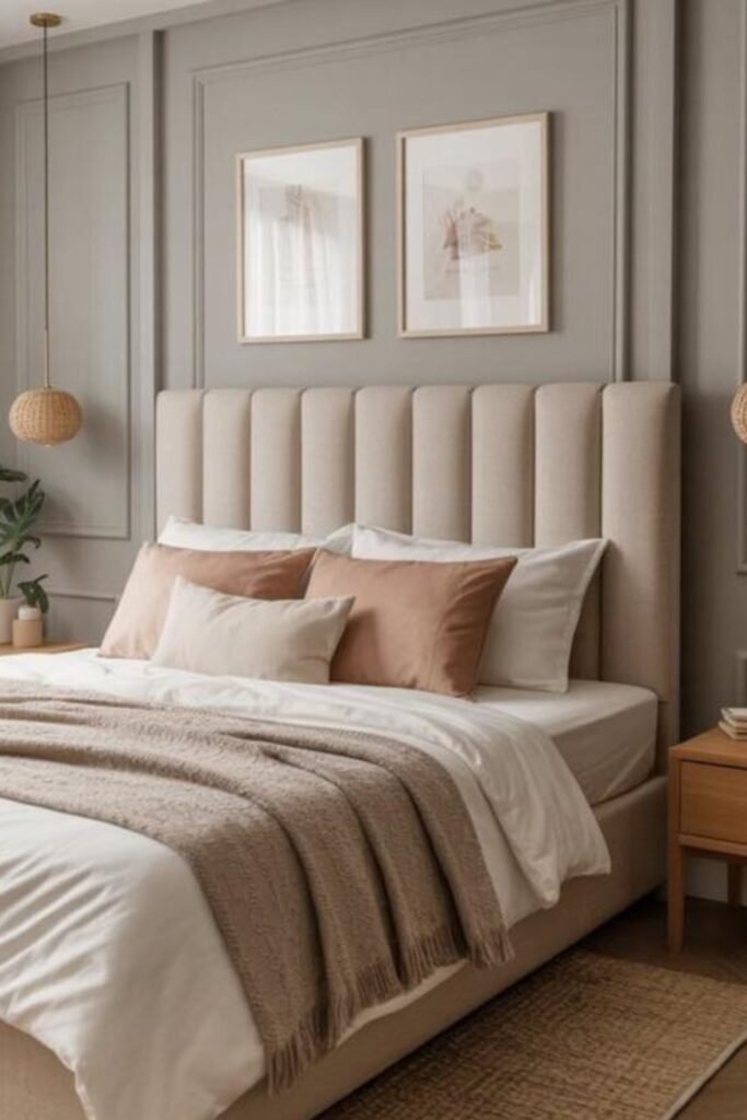 You’ll notice how the soft gray-taupe backdrop frames the upholstered headboard without overpowering it.