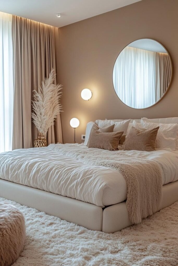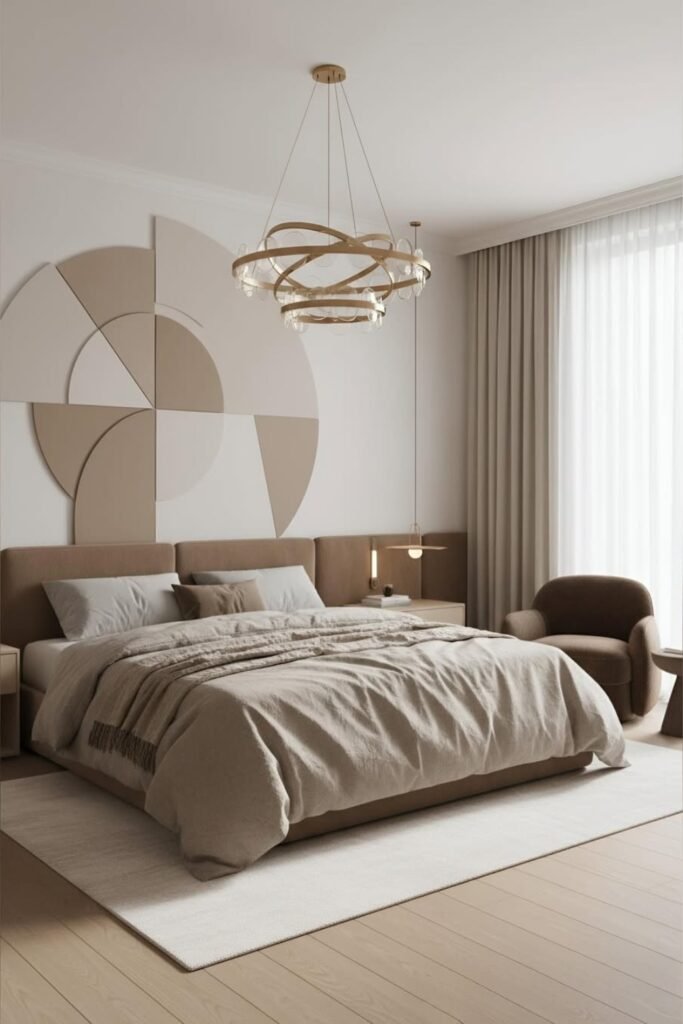 This works best in modern bedrooms with high ceilings, you should stick to one neutral family, then introduce bold forms through wall art or lighting to make taupe feel designed, not basic.