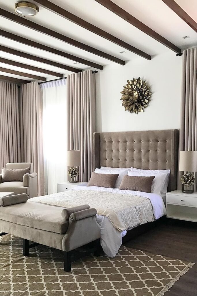 You’ll see how the tall upholstered headboard draws the eye up, while full-length taupe curtains add vertical flow and make the room feel taller.