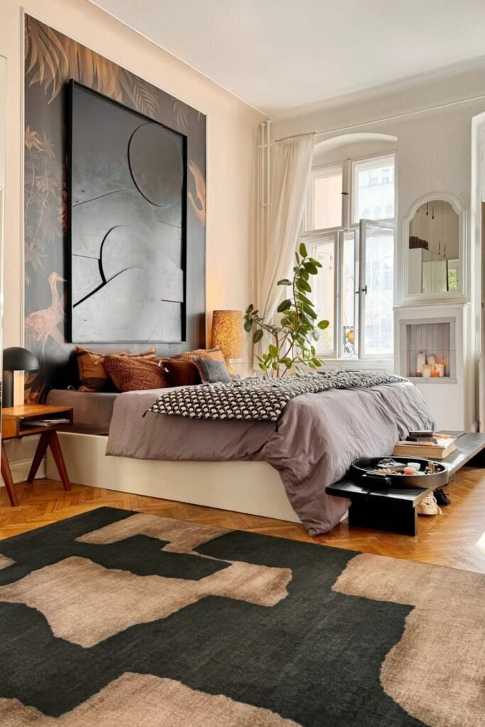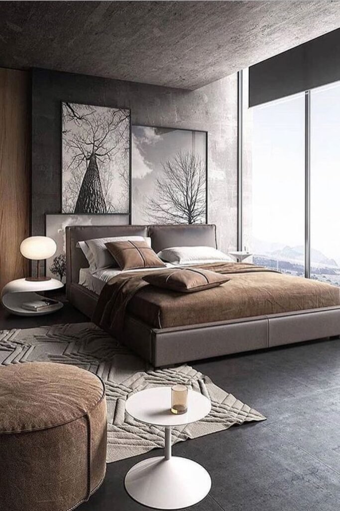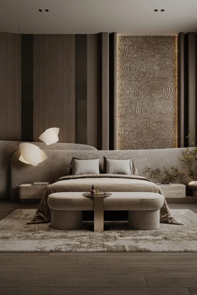 This style suits spacious bedrooms with high ceilings, you should stick to tonal taupes, add one statement texture behind the bed, and use soft lighting to keep the drama refined, not overwhelming.