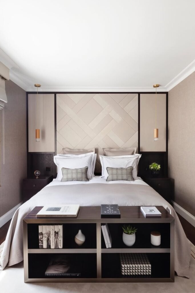 This works especially well in smaller bedrooms, you should stick to pale taupe tones, simple furniture lines, and warm lighting to create a smooth, uncluttered look.