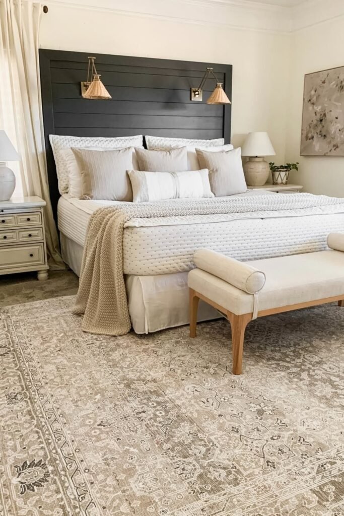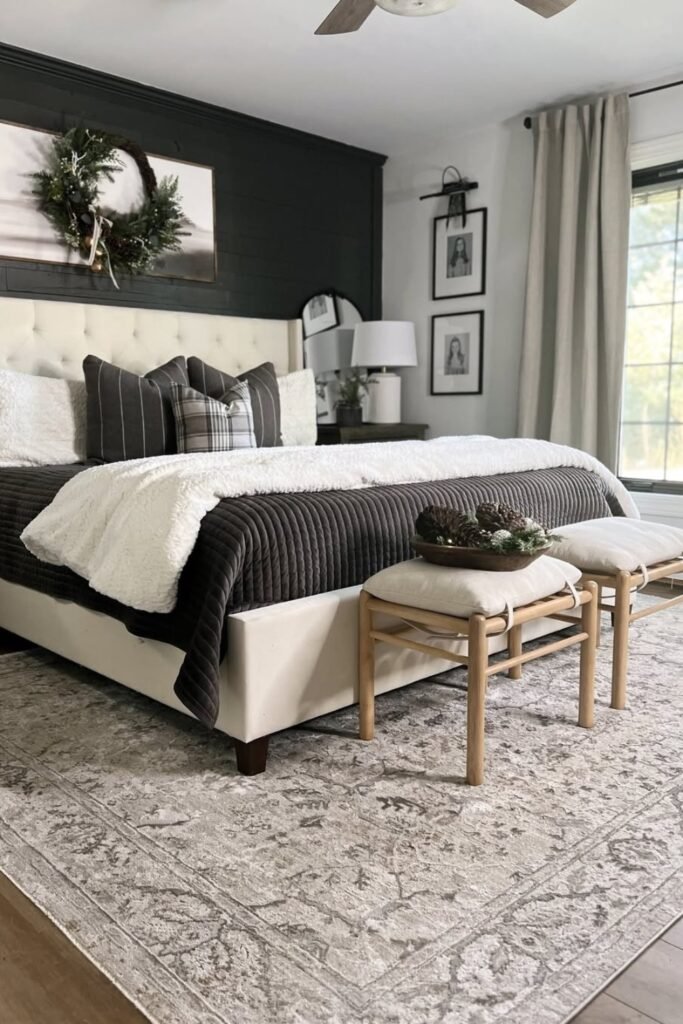 You’ll see how the black accent wall makes the soft taupe bed and layered bedding stand out instead of blending in.