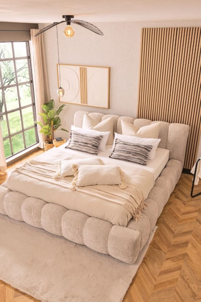 You’ll see how the upholstered bed, layered throws, and wood slat panel bring depth without breaking the neutral palette.