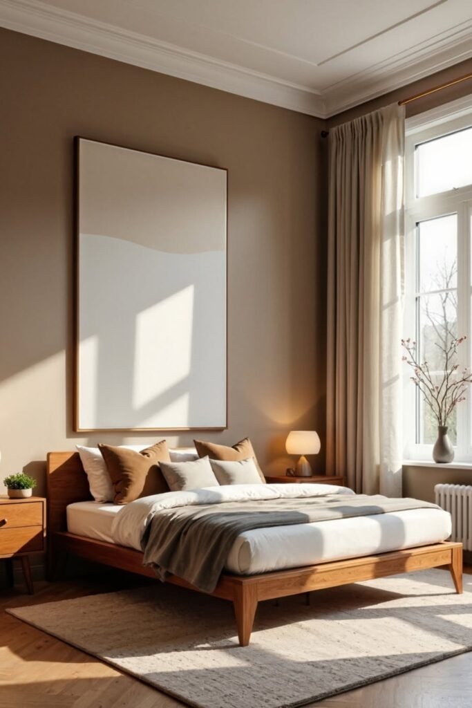 This setup fits bedrooms with large windows, you can pair warm taupe with natural wood and soft linen curtains, keeping decor minimal so the color feels calm, not crowded.
