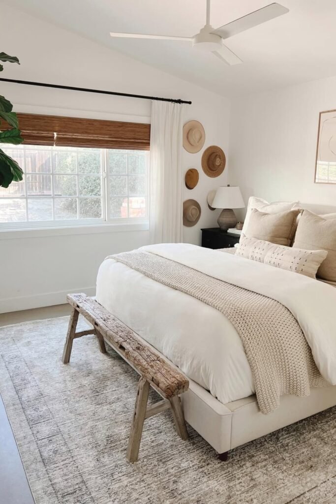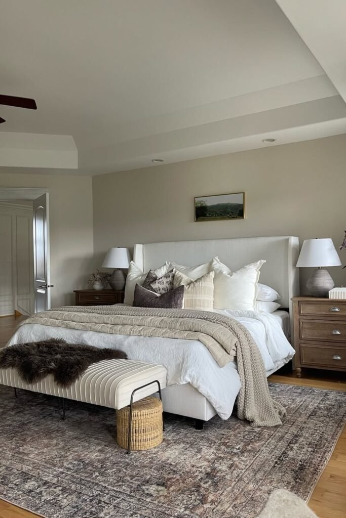You can add warm wood nightstands and a patterned rug to stop the room from feeling flat. Even the bench adds another soft layer without breaking the calm.