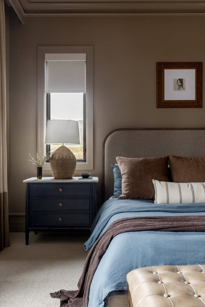 When you’re tired of light neutrals, you can let taupe go deeper. You’ll see how warm taupe walls create a cozy backdrop, but the blue bedding keeps the room from feeling too brown.