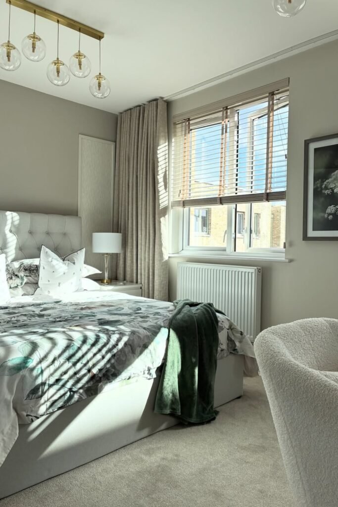 You’ll find this works beautifully in sunlit bedrooms, keep your walls calm, then add botanical prints or one rich green accent to wake the room up without overpowering it.