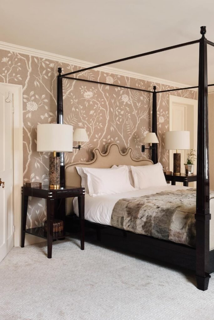 You’ll see how taupe floral wallpaper adds movement without overpowering the room, while a deep wood canopy bed frames everything with strength.