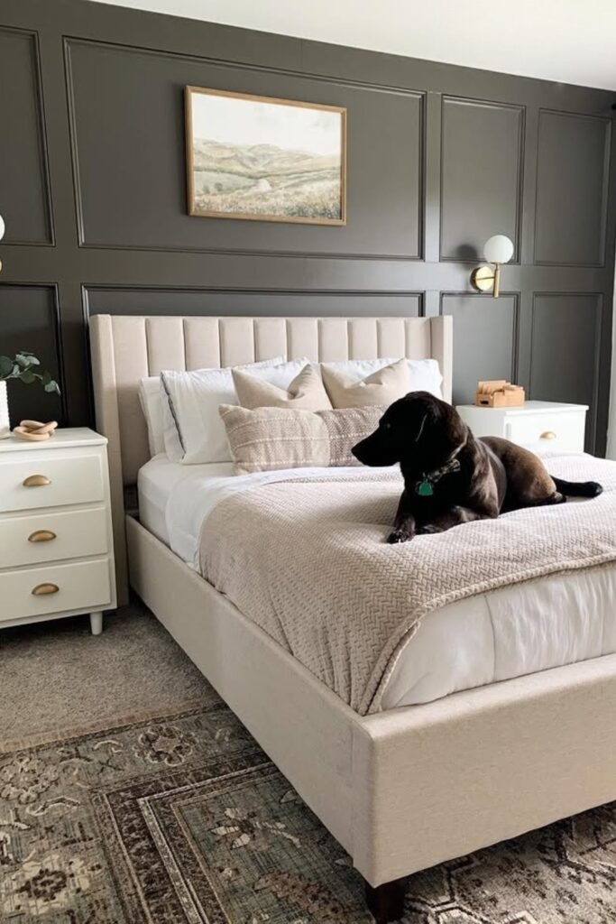 You can see how the deep bronze paneling stays grounded because you keep the bed, nightstands, and bedding light and creamy.