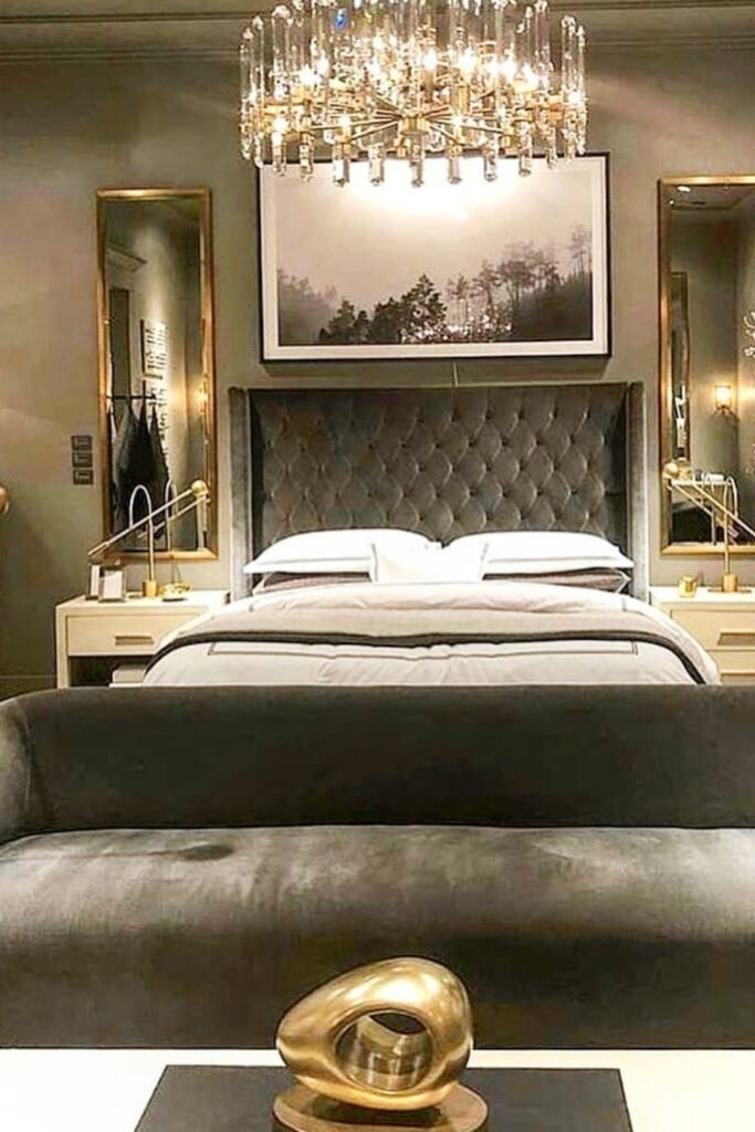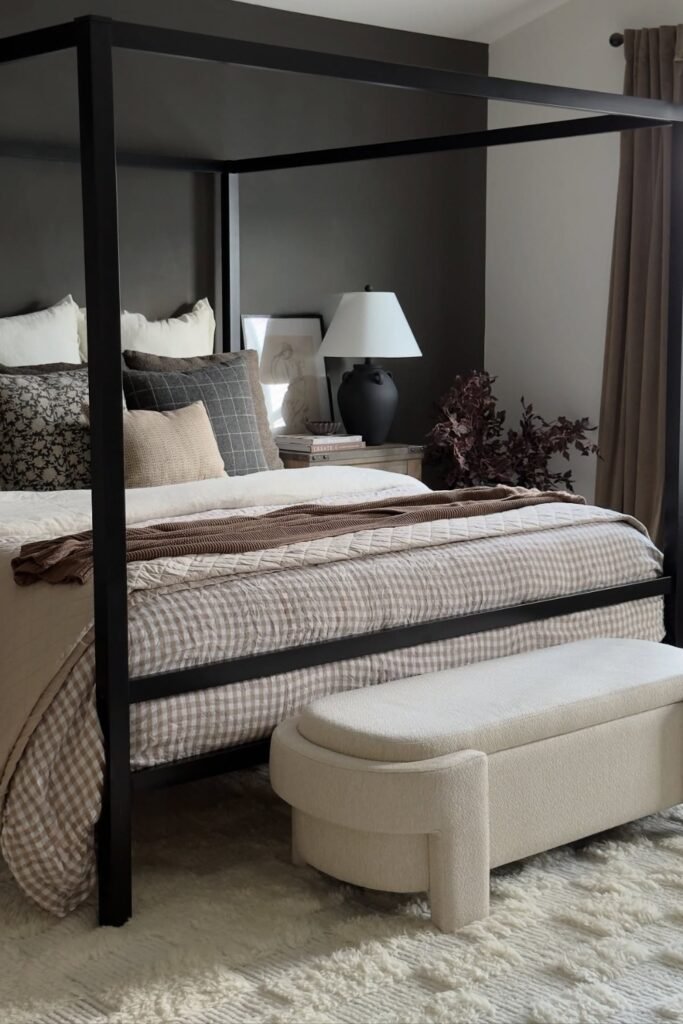 If you want your bedroom to feel expensive the moment you walk in, you can pair Urbane Bronze with velvet, brass, and layered lighting.